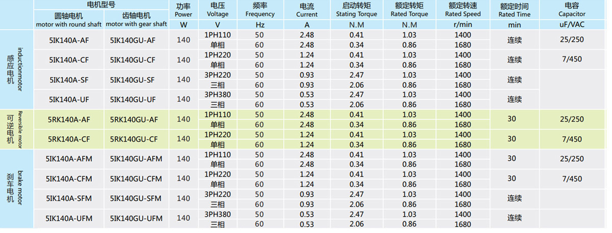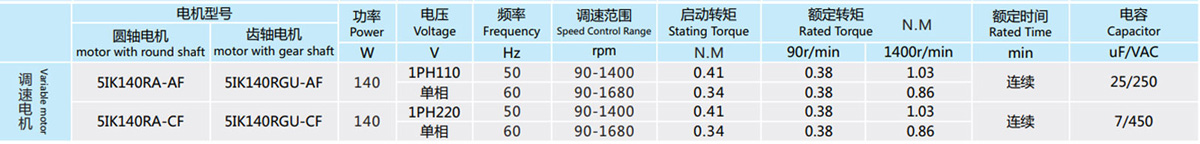 注意:使用电压和机型不同,电容容量不一样,订货时请务必指明具体的型号。 转速是以电动机的异步转速(50Hz:1400r/min、60Hz:1680r/min)为基准除以减速比而算 出来的数值。实际转速将随负载大小变化而有所变化。 需要大于上表的减速比进行进-步减速时,可在电动机与减速器之间安装减速比为1 : 10的中间减速器。 300K以上电机不适合重载场合使用。