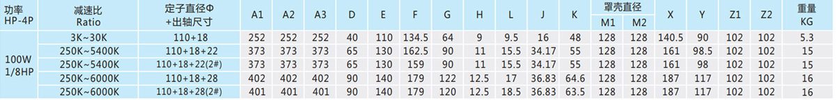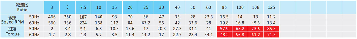 表列转速是基于电机异步转速(50Hz:1400r/min、60Hz:1680r/min),额定负载时,实际转速为表列转速的80%-98%。