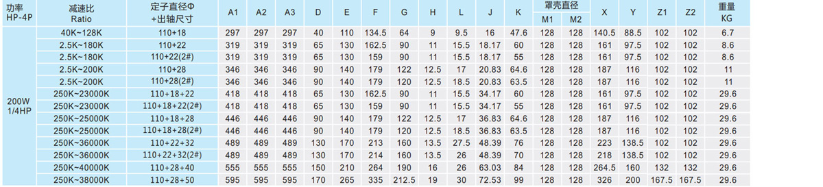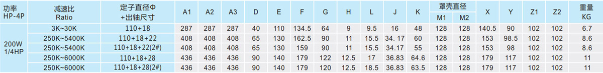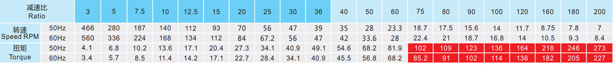 表列转速是基于电机异步转速(50Hz:1400r/min、60Hz:1680r/min),额定负载时,实际转速为表列转速的80%-98%。