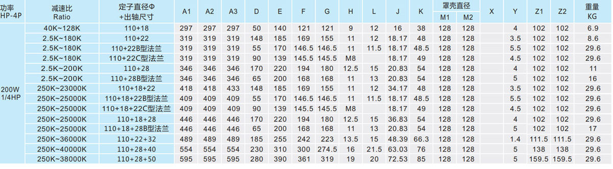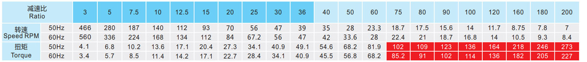 表列转速是基于电机异步转速(50Hz:1400r/min、60Hz:1680r/min),额定负载时,实际转速为表列转速的80%-98%。