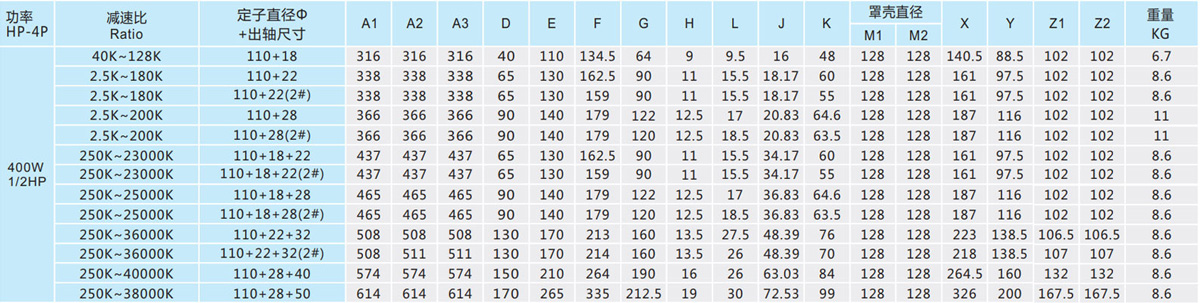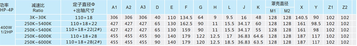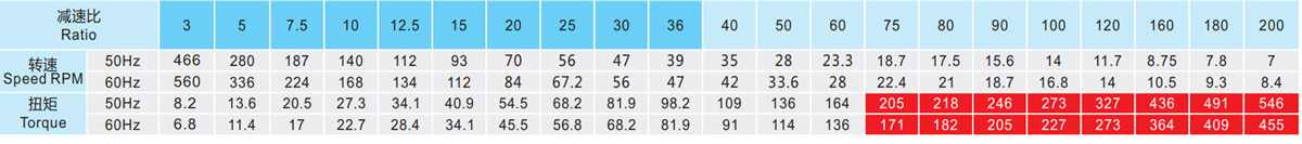 表列转速是基于电机异步转速(50Hz:1400r/min、60Hz:1680r/min),额定负载时,实际转速为表列转速的80%-98%。