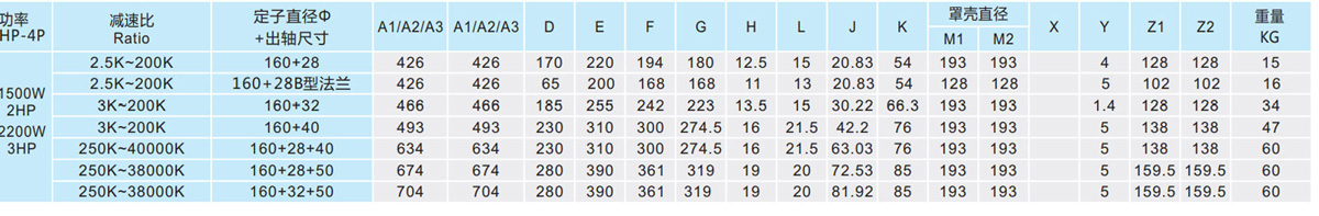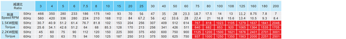 表列转速是基于电机异步转速(50Hz:1400r/min、60Hz:1680r/min),额定负载时,实际转速为表列转速的80%-98%。