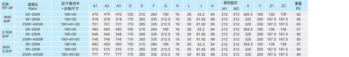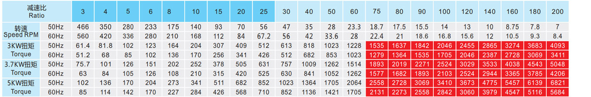 表列转速是基于电机异步转速(50Hz:1400r/min、60Hz:1680r/min),额定负载时,实际转速为表列转速的80%-98%。