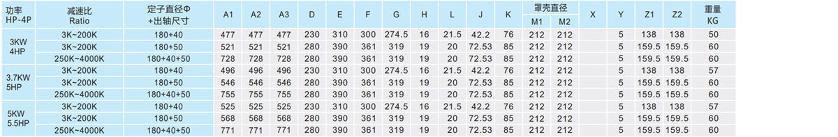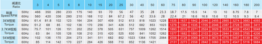 表列转速是基于电机异步转速(50Hz:1400r/min、60Hz:1680r/min),额定负载时,实际转速为表列转速的80%-98%。