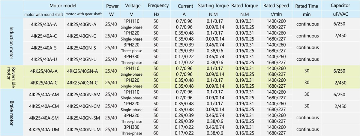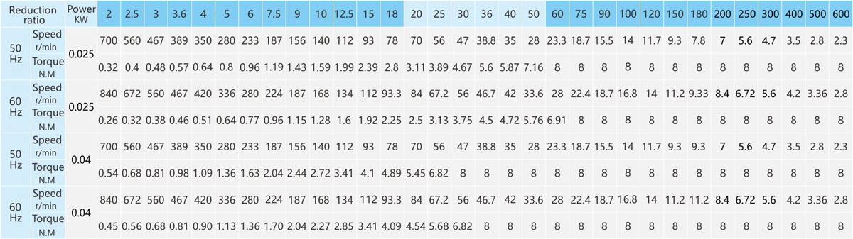 Note: Different voltages and models have different capacitances, please be sure to specify the specific model when ordering. The speed is calculated by dividing the asynchronous speed of the motor (50Hz: 1400r/min, 60Hz: 1680r/min) by the reduction ratio. The actual speed will vary with the size of the load. When a reduction ratio larger than the above table is required for step-by-step deceleration, an intermediate reducer with a reduction ratio of 1:10 can be installed between the motor and the reducer. Motors above 300K are not suitable for heavy-duty applications.