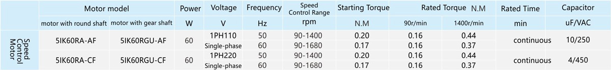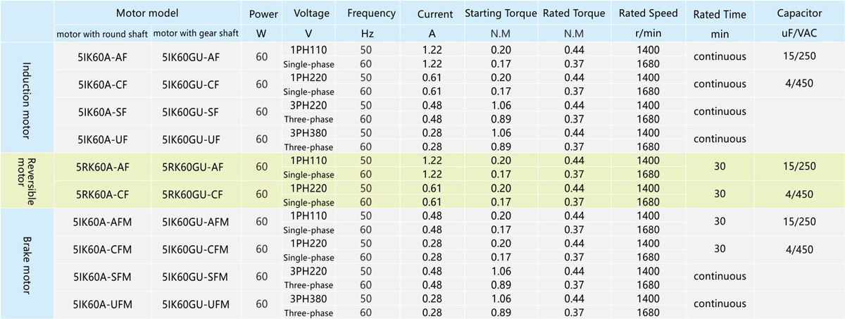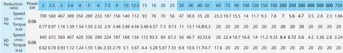 Note: Different voltages and models have different capacitances, please be sure to specify the specific model when ordering. The speed is calculated by dividing the asynchronous speed of the motor (50Hz: 1400r/min, 60Hz: 1680r/min) by the reduction ratio. The actual speed will vary with the size of the load. When a reduction ratio larger than the above table is required for step-by-step deceleration, an intermediate reducer with a reduction ratio of 1:10 can be installed between the motor and the reducer.Motors above 300K are not suitable for heavy-duty applications.