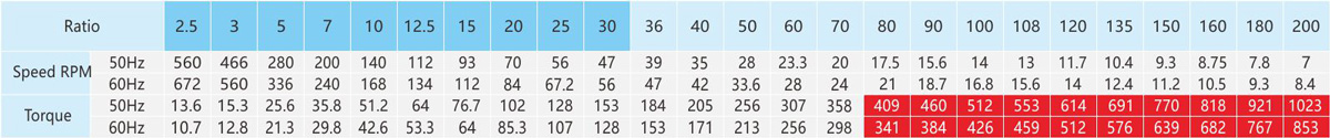 The table speed is based on the asynchronous speed of the motor(50Hz:1400r/min、60Hz:1680/min),the actual output speed under rated torque conditions,is about2-20% less than synchronous speed . 2.Light duty type is not available for standred application design,it is only suitable for special project design.As te-chnical data for these machines may be advantaged, please contact us or visit the company website. 3.The specifications of the product may be modified for improvement without notice.Not allow for publish without formal approved.