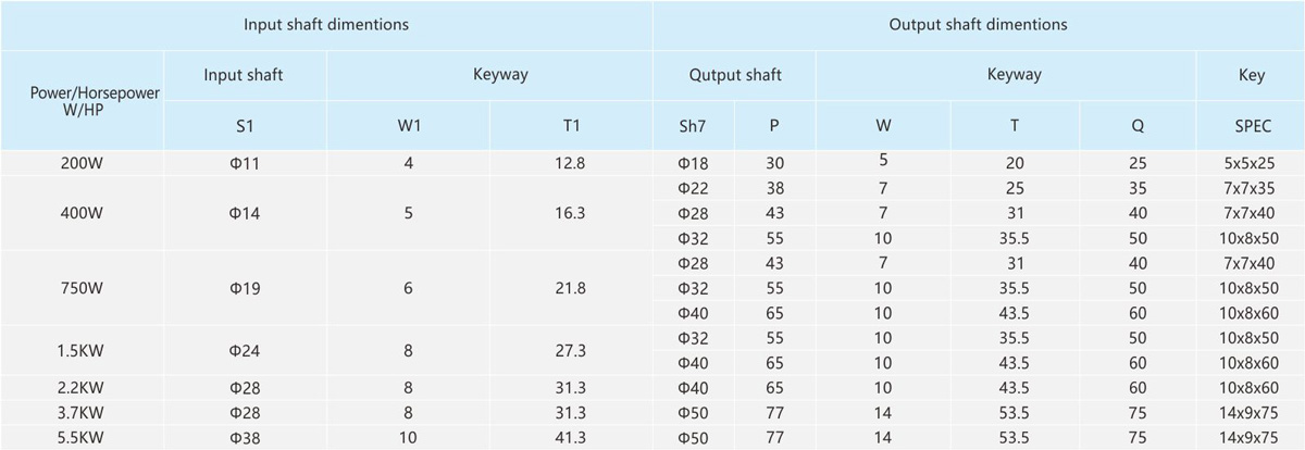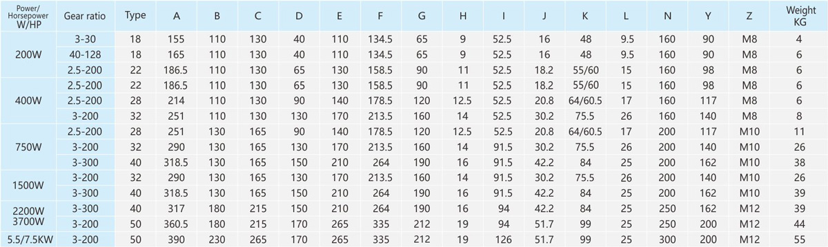 The table speed is based on the asynchronous speed of the motor(50Hz:1400r/min、60Hz:1680/min),the actual output speed under rated torque conditions,is about2-20% less than synchronous speed . 2.Light duty type is not available for standred application design,it is only suitable for special project design.As te-chnical data for these machines may be advantaged, please contact us or visit the company website. 3.The specifications of the product may be modified for improvement without notice.Not allow for publish without formal approved.